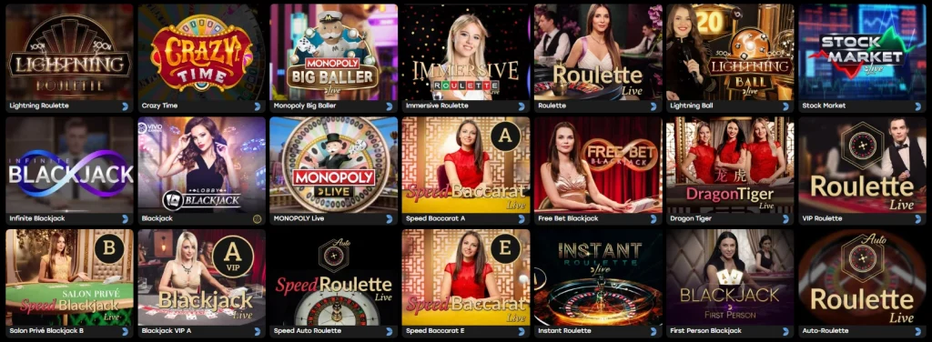 - Game Shows: Enjoy exciting, interactive game shows like Crazy Time, Monopoly Live, and Dream Catcher.